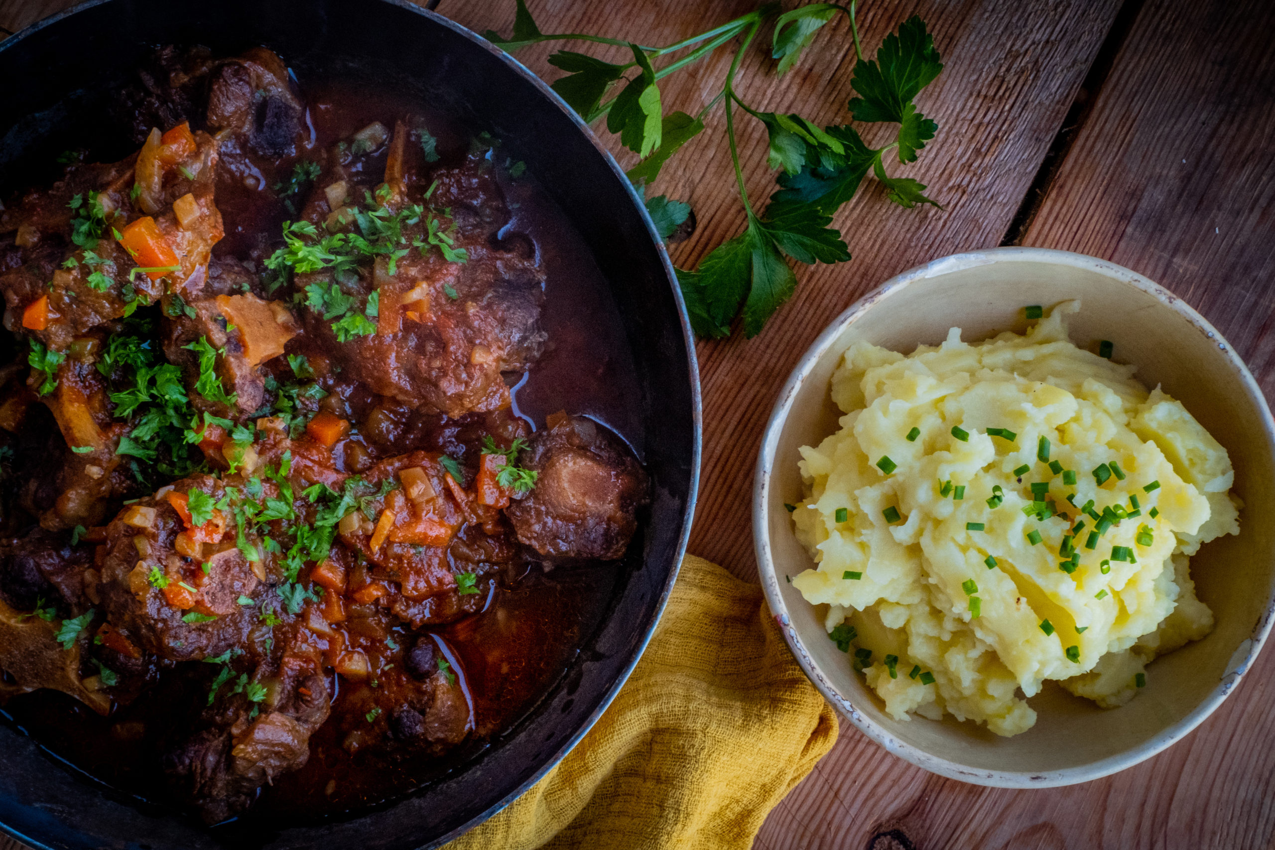 Finhakk hvitløken, og del grønnsakene og baconet i små biter. Stek baconet godt i gryta, og ha deretter i hvitløken og grønnsakene. Stek i noen minutter. Ha i hvitvinen og la det koke i ca. 5 minutter. Tilsett tomatpureen, kokekraften fra oksehalene og krydderet, og ha halestykkene tilbake i gryta. Legg på lokket og la det småkoke i minst 3 timer. Tilsett mer kraft dersom det koker tørt.