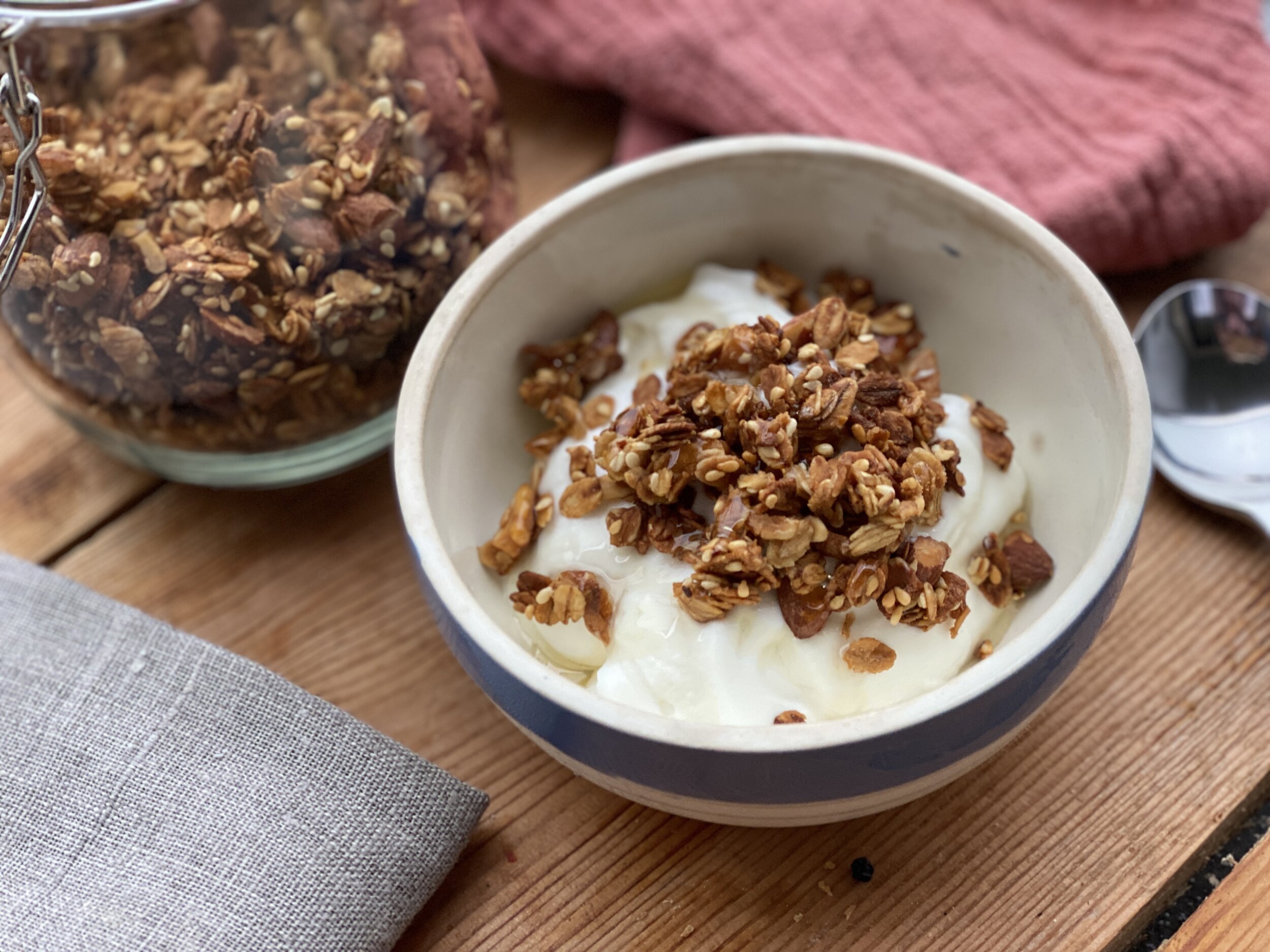 Granola smaker nydelig med yoghurt og litt flytende honning.