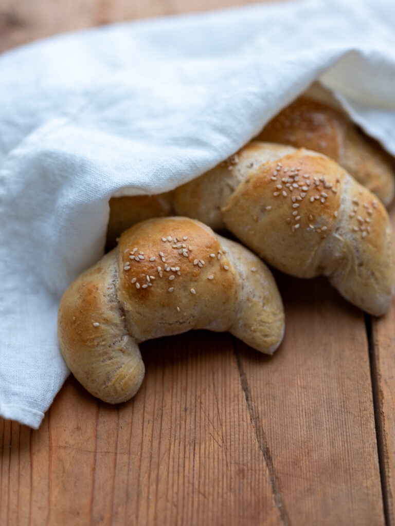 Pensl hornene med pisket egg og dryss på sesamfrø. Stek midt i ovnen på 200 grader i ca 17 minutter.