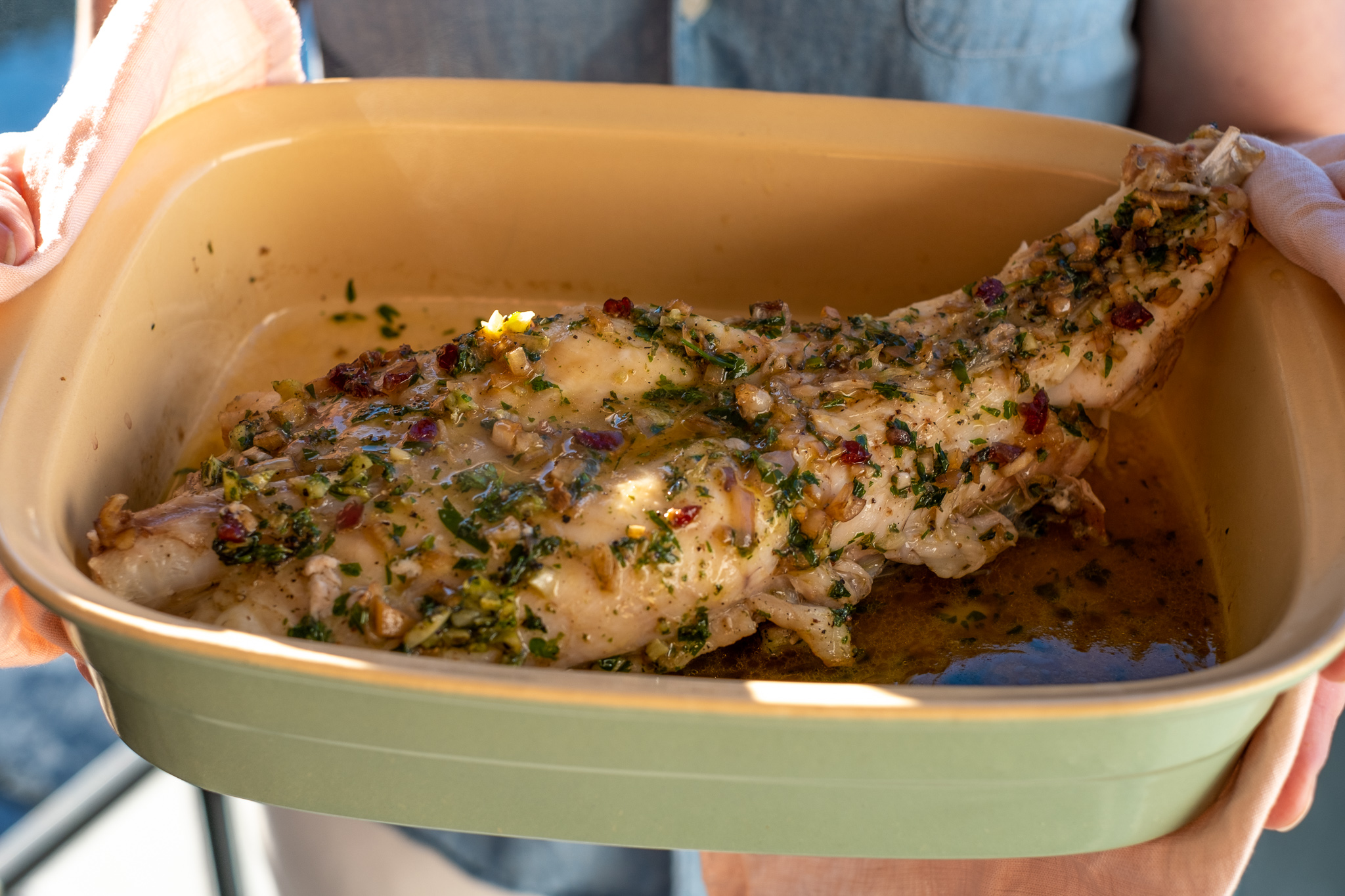Breiflabb er en fantastisk råvare og kjøttet blir ekstra saftig når det helstekes med bein. Prøv helstekt breiflabbhale med urter og nydelig nøttesmør!