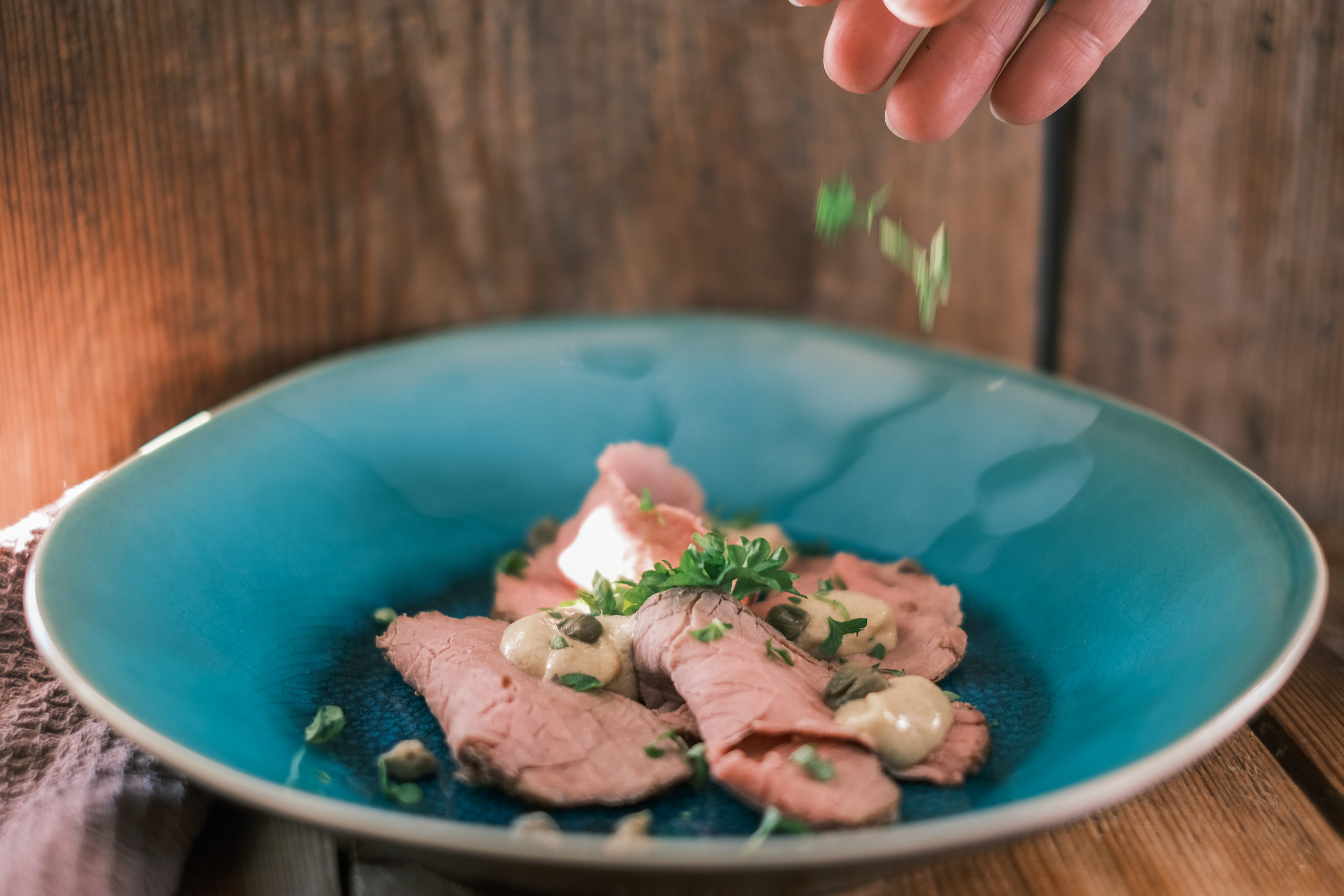 Skjær kalvekjøttet i tynne skiver. Legg kalvekjøttet på en tallerken, og ha sausen oppå kjøttet. Pynt med kapers og persille og ha over noen dråper god olivenolje. Kvern over litt pepper til slutt.