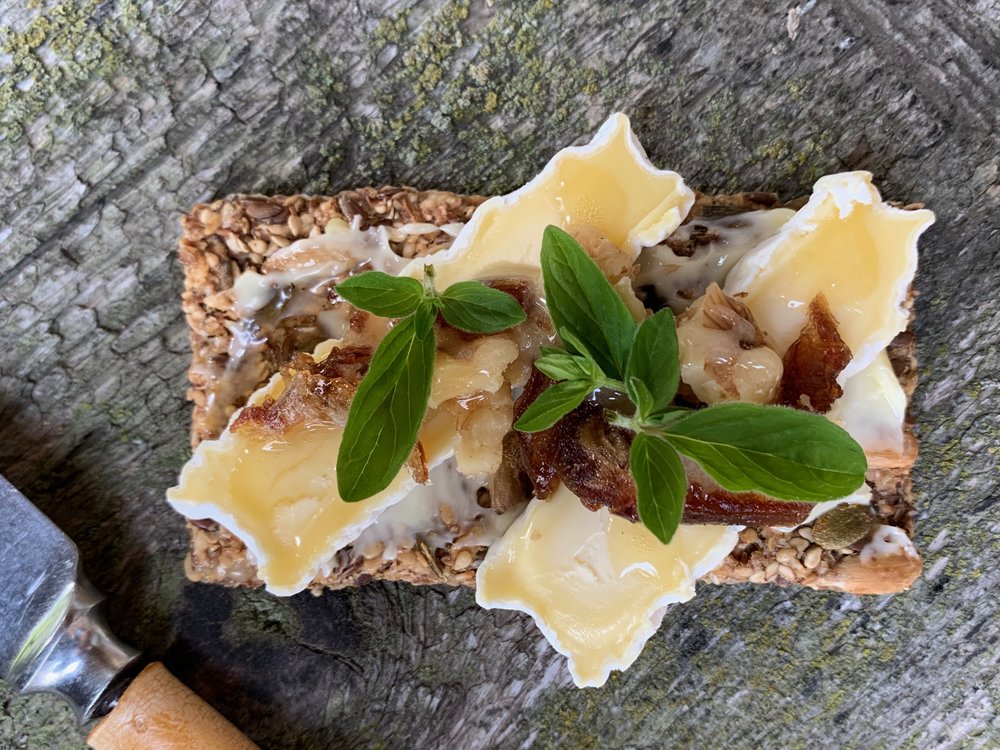 Her servert med ost fra Tjamsland ysteri, valnøtter, dadler, flytende honning og frisk oregano fra hagen.