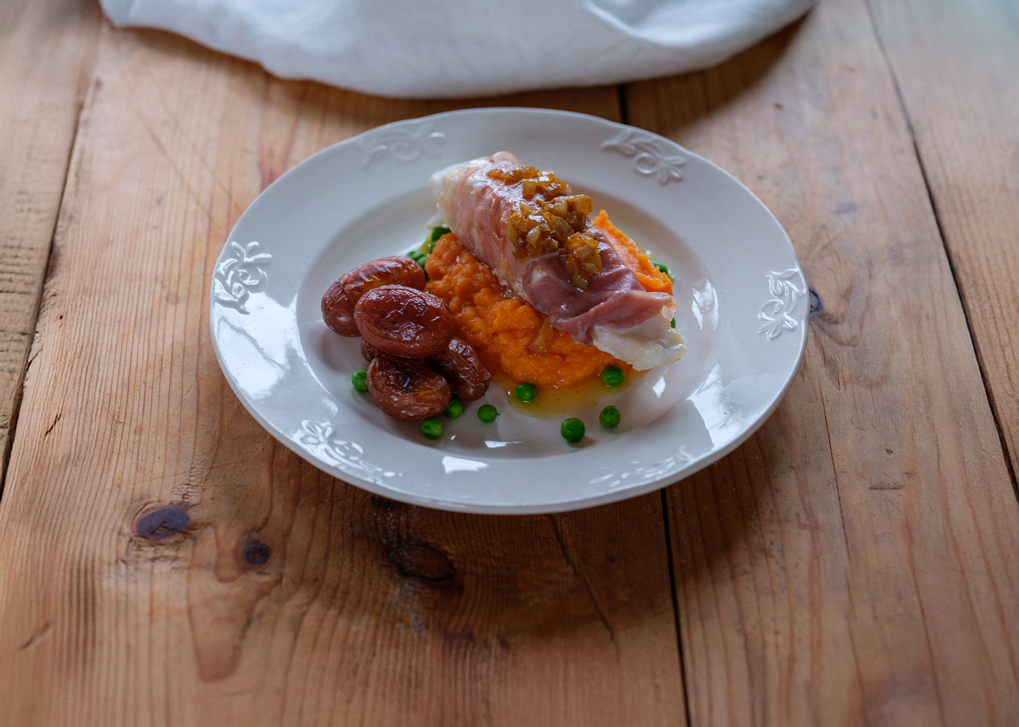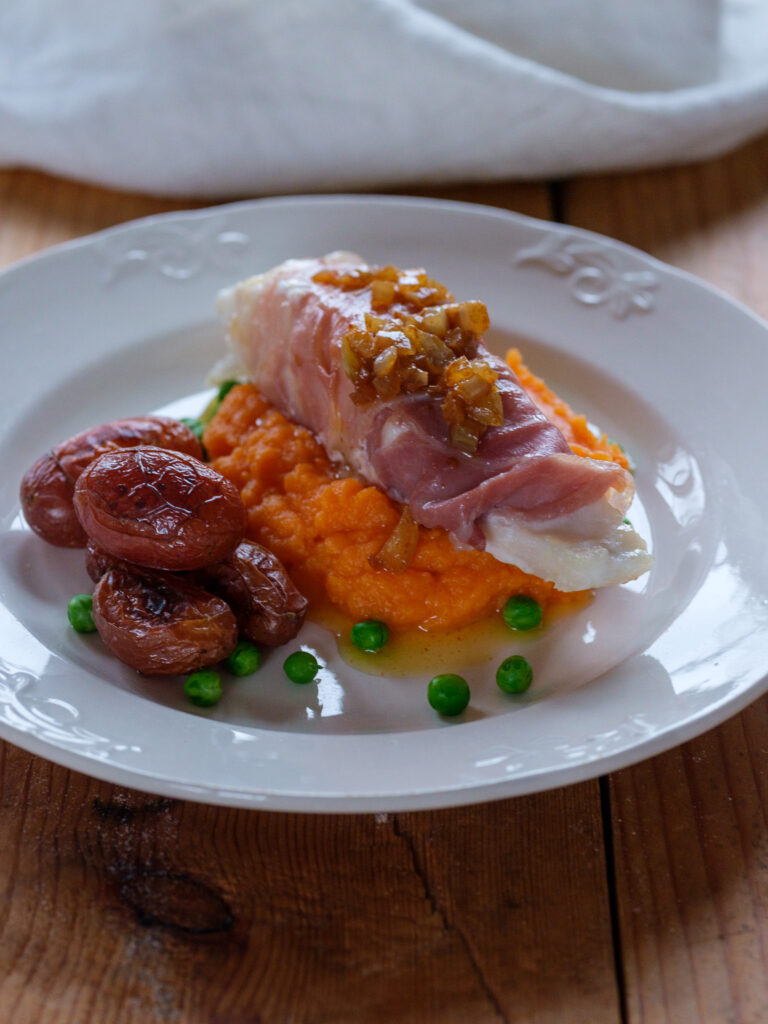 Surr en skive parmaskinke rundt hver kveitefilet. Stek de raskt i panne på høy varme, og sett de i ovnen på 180 grader i ca.15. minutter.