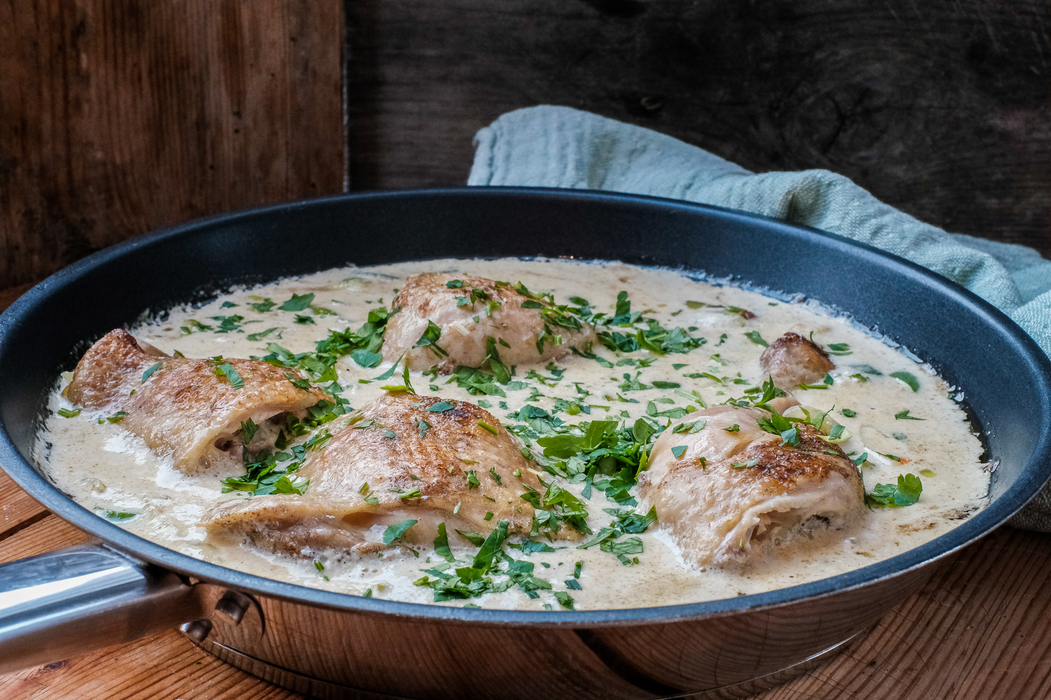Legg så kyllinglårene tilbake i panna og hell på 3 dl vann. Ha på et lokk og la det koke i ca. 2 timer, ha så i fløte og sennep. La det koke ytterligere 20 minutter. Smak til med salt og pepper.