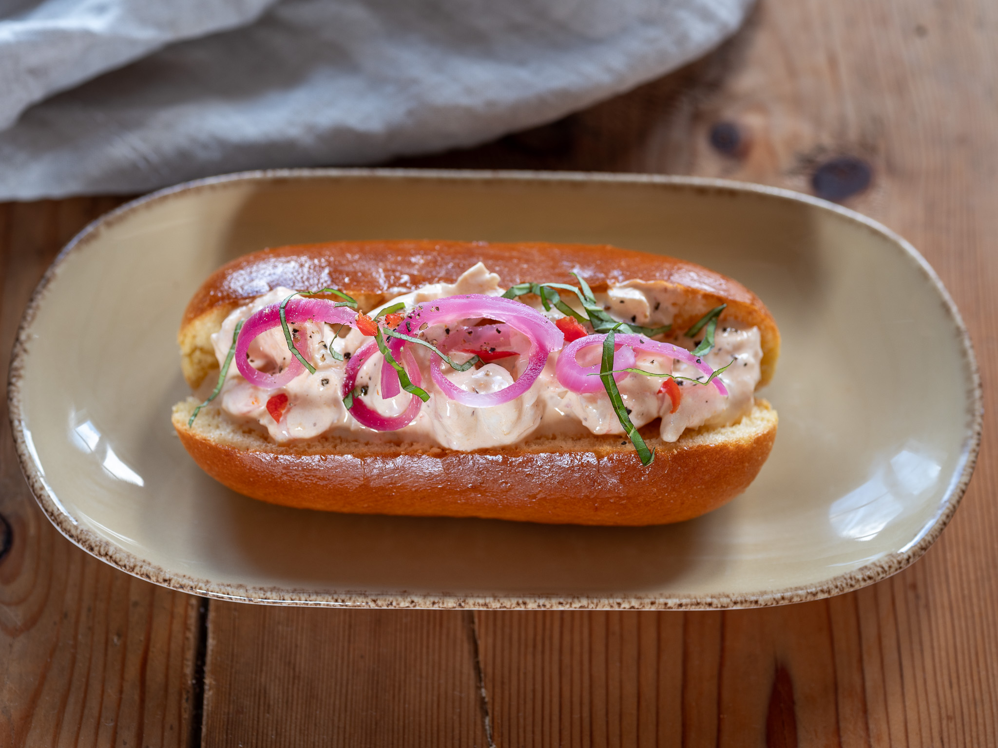 Fyll pølsebrøda med hummerfyllet og topp det med sylta rødløk. Ha gjerne litt chilisaus, urter og pepper på toppen.