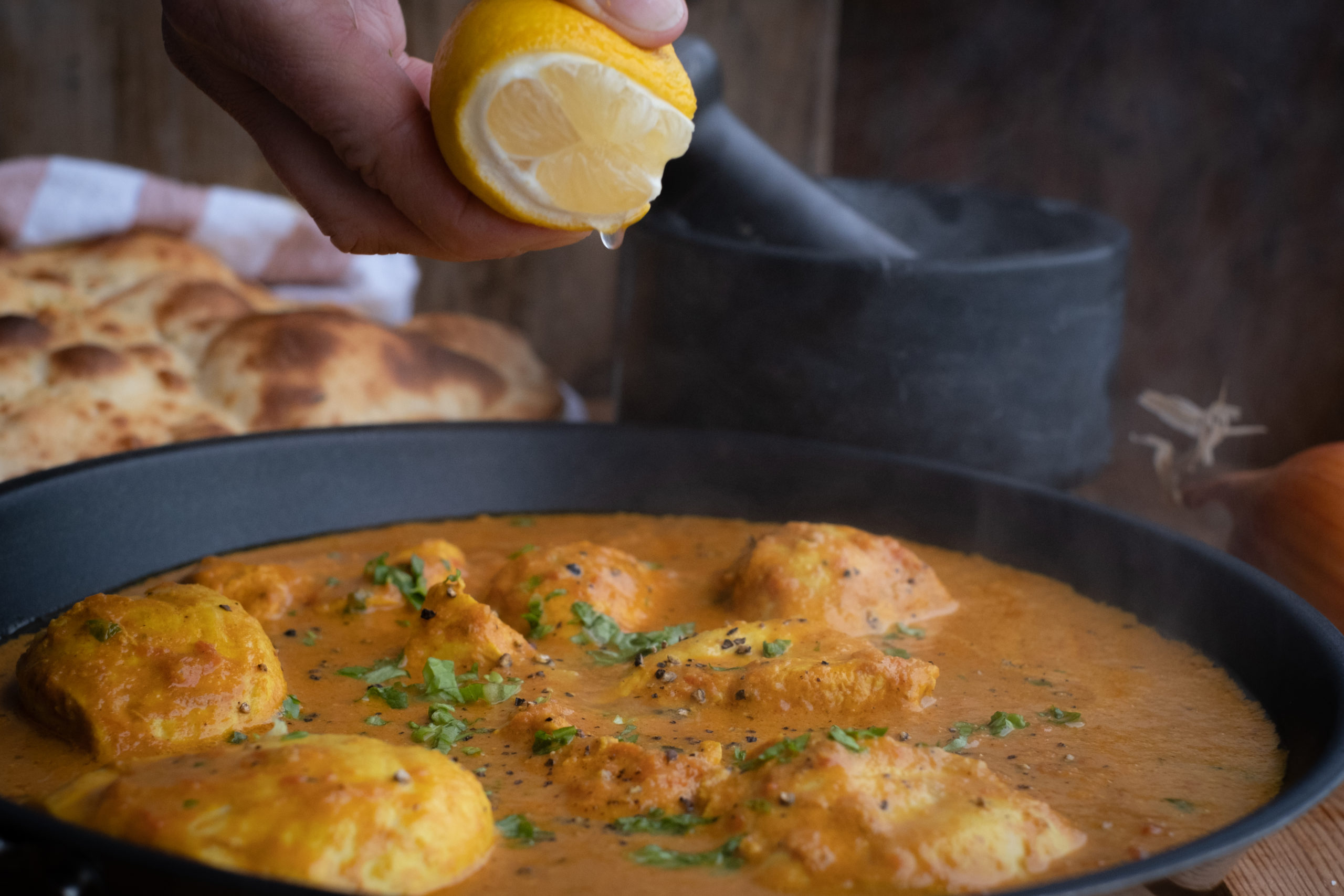 Skvis over litt sitron og pynt gjerne med frisk koriander på toppen. Server med ris og nanbrød. Se oppskrift på nanbrød her.