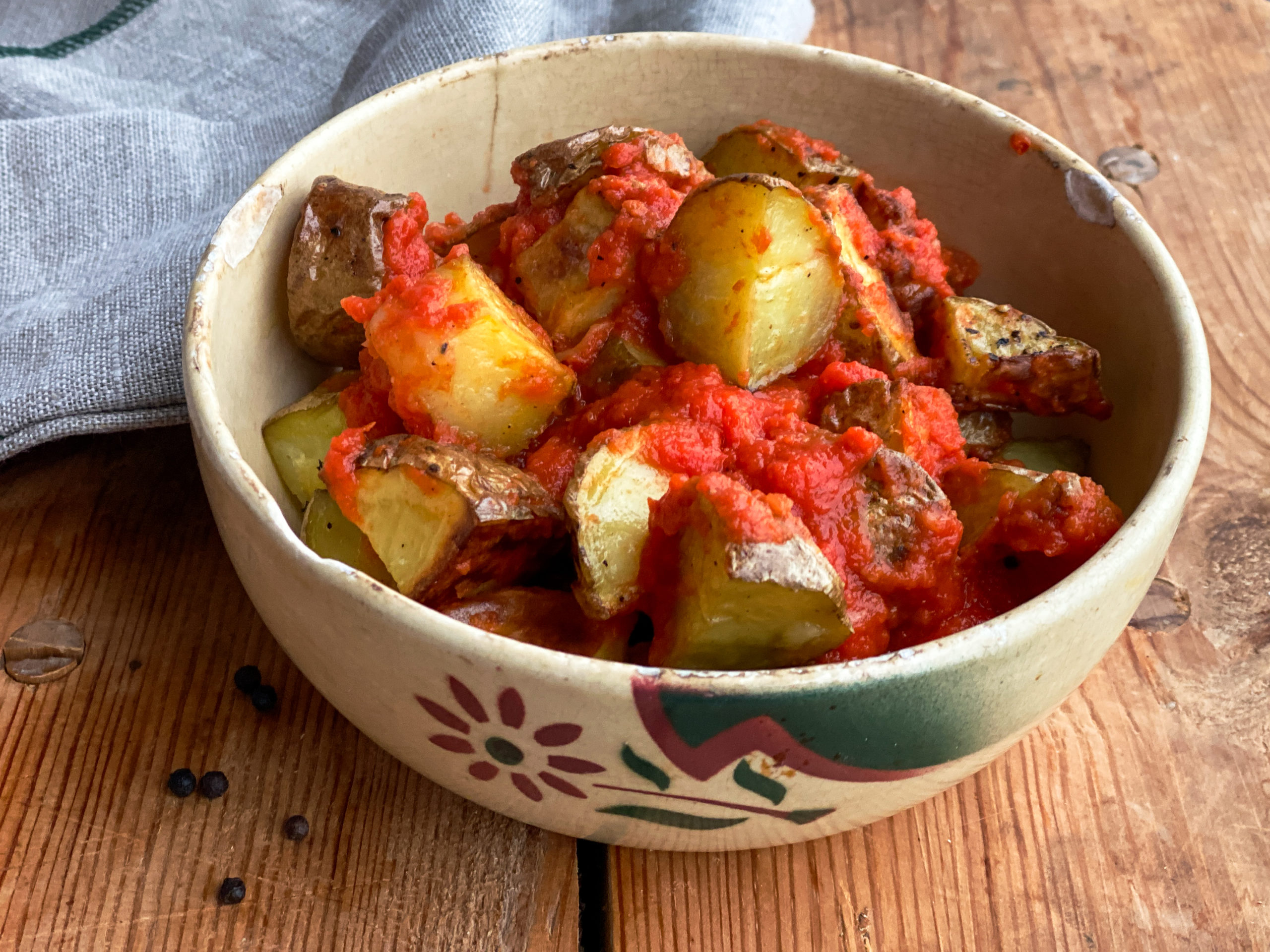Patatas bravas er en populær spansk tapasrett bestående av ovnsbakte eller friterte poteter i en spicy saus. Du avgjør selv hvor heit du ønsker sausen ved å justere chilimengden. Retten fungerer også supert som tilbehør til kjøtt.