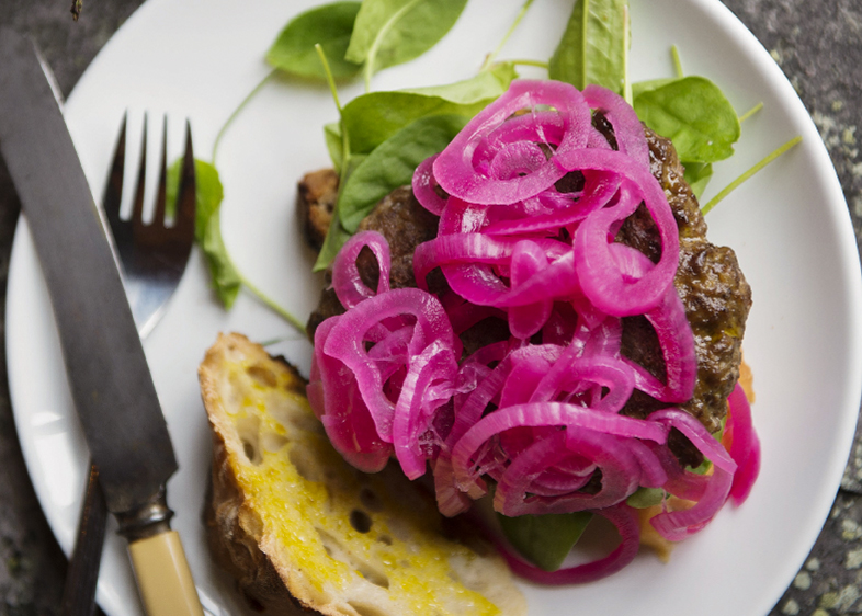 Hell litt god olje på en skive godt brød, og legg på salat og en lun karbonade – og dander med syltet rødløk.