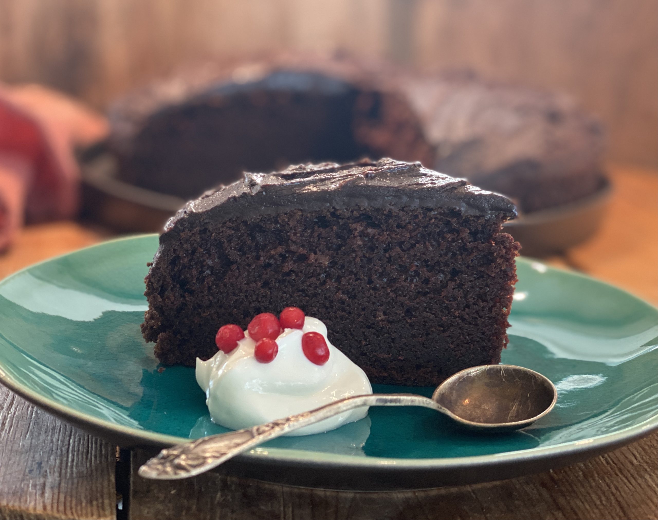 Smelt smør i en gryte, tilsett vann. Rør inn sukker, creme fraiche, egg, kakaopulver og natron. Sikt inn melet og rør til en klumpfri røre.