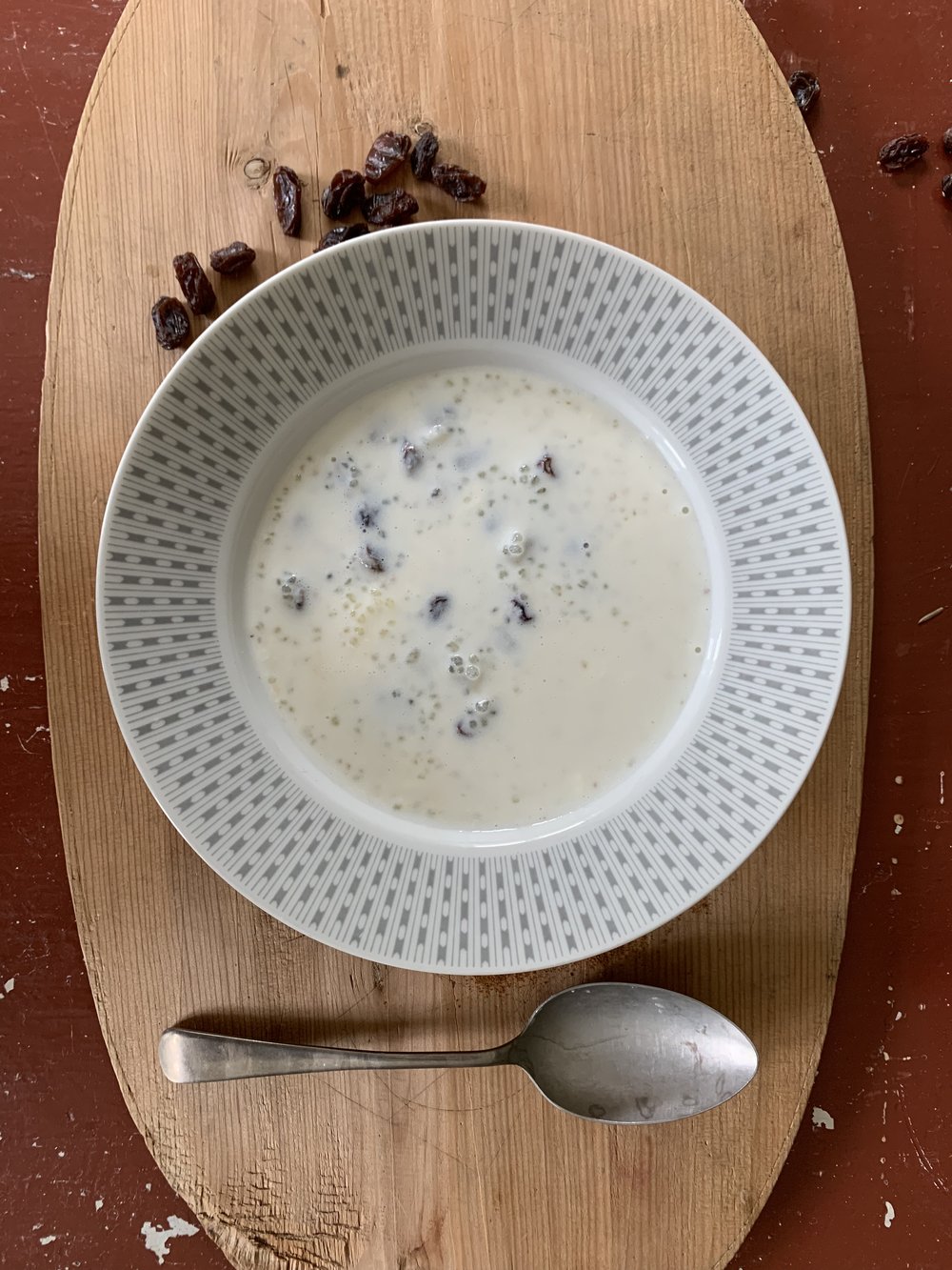 Kok opp melken og ha i grynene. Rør til det er godt i kok. Suppa skal småkoke under lokk i 15 minutter. Ha i rosinene de siste ti minuttene av koketiden. Smak suppa til med salt.