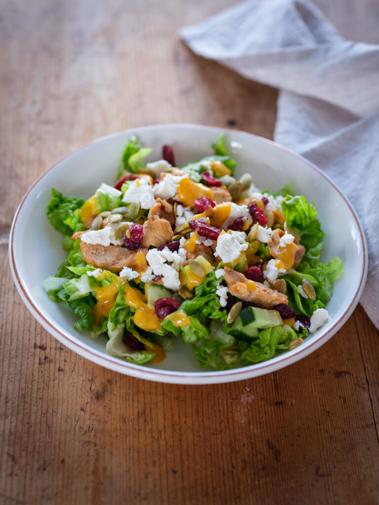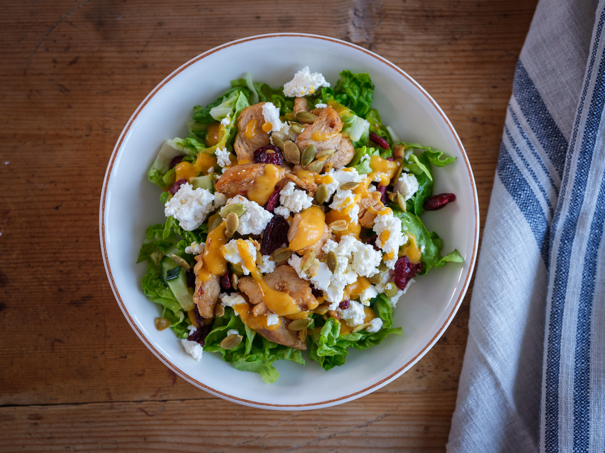 Ha salat, agurk og kylling i en stor bolle. Ha over solsikkekjerner og tranebær. Hell over dressing og smuldre fetaost på toppen.