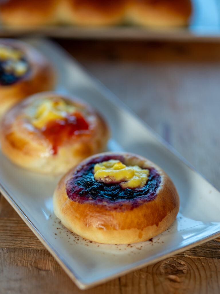 Når bollene er ferdig hevet lager du en «grop» i midten av hver bolle. Du kan eventuelt trykke med et lite glass. Fyll «gropen» med vaniljekrem og litt blåbærsyltetøy. Pesle gjerne bollene med sammenpisket egg.